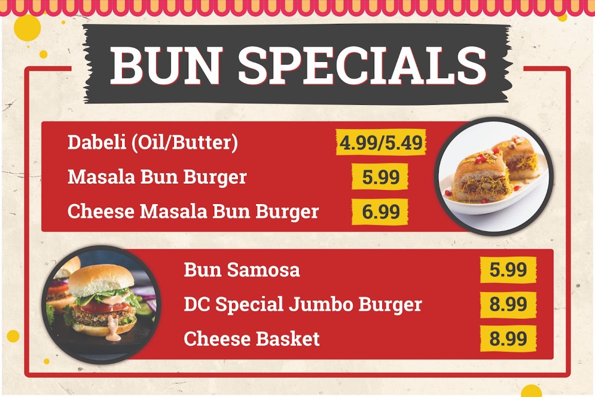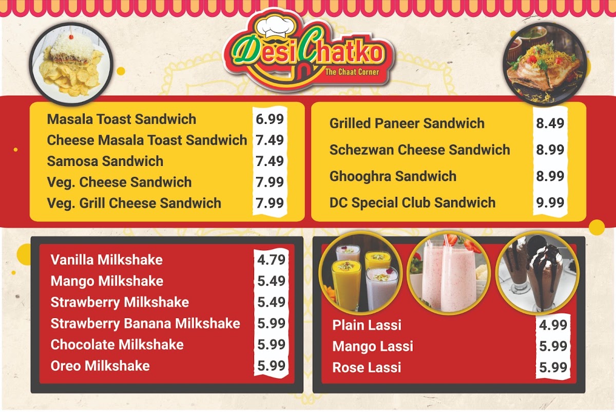 From a reviewer’s perspective, the menu at Desi Chatko offers a vibrant mix of classic Indian street food and comforting beverages, making it both approachable and satisfying. The refreshing Rose Lassi, Mango Lassi, and Plain Lassi set a cooling tone, while the sandwich selection stands out with flavorful options like the Grilled Paneer Sandwich, DC Special Club Sandwich, and Cheese Corn Capsicum Sandwich, alongside indulgent choices such as the Cheese Masala Toast Sandwich and Veg Cheese Sandwich. The bun section adds a street-food twist, featuring items like the Spicy Paneer Puff, Masala Bun Burger, and the popular Dabeli (Oil/Butter), with upgrades like the Cheese Masala Bun Burger and Extra Cheese enhancing richness. For drinks, the traditional Masala Chai provides a warm, spiced balance, while milkshake lovers can enjoy treats like the Oreo Milkshake, Vanilla Milkshake, Mango Milkshake, Chocolate Milkshake, and Strawberry Banana Milkshake. Finally, the chat specialties-including Basket Chat, Sev Puri, Bhel Puri, and the refreshing Pani Puri (Cold)-bring authentic street flavors to the forefront. Overall, the menu feels diverse and thoughtfully curated, appealing to both adventurous eaters and those seeking familiar comfort foods.